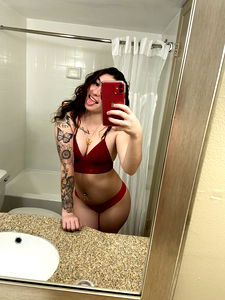 A female model with tattoos in a red bikini takes a mirror selfie. She is leaning on the bathroom counter, capturing her reflection. The bathroom has a sink and a shower door, with a tile wall. A single white toilet can be seen in the background.
