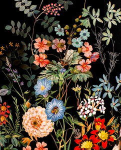 Ari, a fan of vintage aesthetics, has created this beautiful floral wallpaper. The design features a vibrant assortment of flowers and plants against a dark background, reminiscent of classic botanical prints. With a variety of blooms, including daisies and roses, the pattern offers a sense of tranquility and charm. Perfect for bringing life to any space, this wallpaper is sure to be a conversation starter.