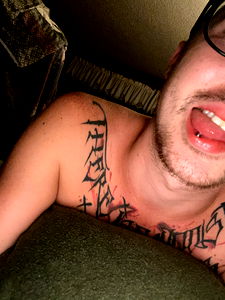 This is an image of Patrick, a young adult male with a beard and tattoos. He is wearing glasses and a tank top, and appears to be outdoors during the daytime. His expression is cheerful and he seems to be in good spirits.