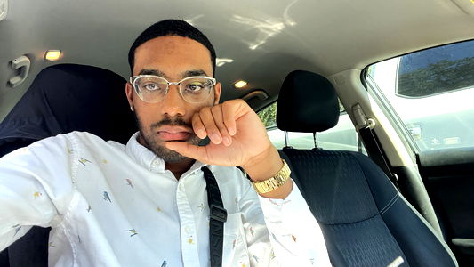 A confident young man in a blue and white shirt, holding up a peace sign from the passenger side of a car. Onlyfans model name is Armani.
