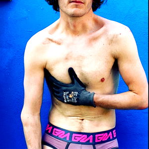 Model Armaxx, from London, England, in a fitness-themed photoshoot. He showcases his physique, wearing only underwear, with one hand on his hip and the other on his thigh. A gym towel is casually draped over his shoulder, adding to the active, fitness vibe.