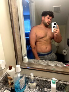 An image of OnlyFans model Dscottc in a bathroom mirror, standing shirtless. He is showcasing his muscles and tattoos.