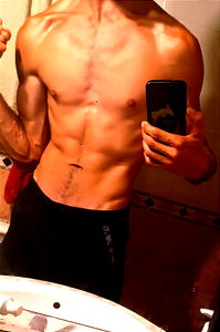 Celebrity OnlyFans model Skullz is a 24-year-old fitness enthusiast. In this image, he's shirtless and confidently posing in what appears to be a Spanish setting.