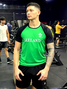 Aron, the athletic model representing Ireland's national team, is captured in a gym with a confident stance. His outfit includes a green jersey and black shorts, emblazoned with the 'Farland' logo. His muscular form and focused gaze suggest dedication to his sport.
