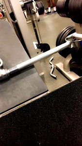This image showcases a barbell with weight plates set on a weight bench inside a gym. The equipment is essential for weightlifting exercises, which focus on the development of strength and endurance.