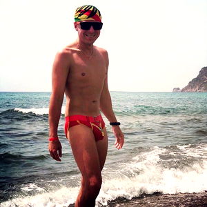 In this photo, Arty is seen showcasing his physique on a beach. He sports a vibrant swimsuit with a playful pattern and stands confidently in front of the water's edge, his gaze directed off to the side, perhaps enjoying the view or waiting for someone. His attire and pose suggest he might be ready for some fun in the sun.