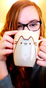 The model, Artemis Eros, is in the process of holding a charming feline-themed coffee mug. She is captured in a moment of warmth and companionship, which is visually appealing. Her attire, consisting of casual yet stylish clothing, adds to the overall aesthetic of the image.