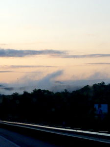 This is a tranquil image of a beautiful sunset view in Missouri. The sky transitions from orange to dark blue, indicating the time of day as either dawn or dusk. A bridge can be seen below, adding depth to the scene. The atmosphere appears peaceful with no visible people.