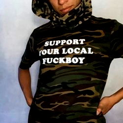 Person standing against white background. Wearing camouflage shirt with the text 'Support Your Local Fuckboy' and matching hoodie.