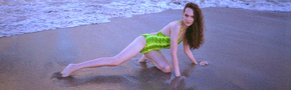 OnlyFans model Candi poses in a vibrant green and yellow striped swimsuit, standing confidently on the sandy shore. She exudes an air of casual elegance, embodying the spirit of beachside relaxation.
