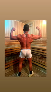 A male model in a gym, showcasing his physique. The image captures the model mid-flex, emphasizing his strength and dedication to fitness.