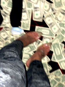 Model Arya Megan standing on a pile of money with her feet up against the background. The image has an artistic and playful vibe. Model is wearing casual attire and appears to be engaging in a fun, lighthearted activity.
