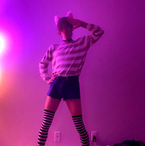 Aryk, the renowned OnlyFans model, is seen in this image confidently posing for the camera. Their outfit and stance suggest a playful yet bold persona. They are striking a pose with one hand on their hip, showcasing their unique style. The background is a purple hue, adding to the artistic and fun vibe of the image.