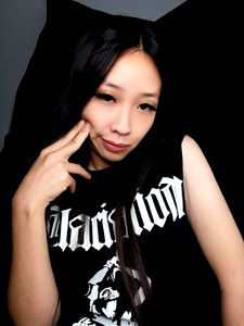 A captivating image of an asian female, exuding a gothic vibe. She sports dark makeup and a tattoo, making her a unique and enigmatic figure.