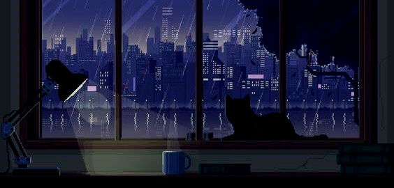 An animated city scene at night, with a character silhouetted against the window. The background showcases a rainy skyline. A dimly lit room and a sense of solitude.