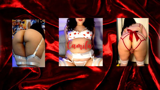 A photograph of an Onlyfans model, named Camila. The image captures her in a seductive pose against a vibrant red background. She is wearing a revealing blue lingerie and has a tattoo on her arm. The red heart in the corner adds a touch of romantic charm.