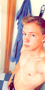 This is an image of a person with a strong and confident posture. They are shirtless, showcasing their physique with visible muscle definition. The individual has short blond hair, and there's a striking contrast between their blonde hair and the darker tone of their skin. They appear to be indoors, possibly in a room with a window, given the natural light that illuminates them.