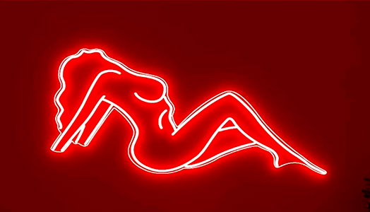 The image showcases a striking individual with vibrant makeup, including red lipstick. They are adorned in bold red hair, giving off an air of confidence and style. Their pose is casual yet elegant, contributing to the overall aesthetic of the image. The background features a purple neon sign, adding a touch of urban chic to the scene.