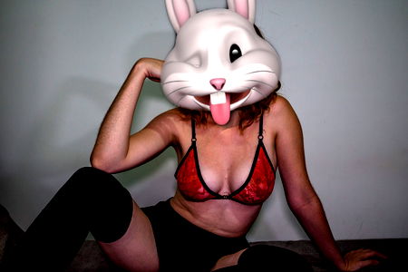Ashley Lux, an adult content model on OnlyFans, is seen with a bunny mask and lingerie, striking a pose in front of a plain backdrop. She appears to be a fan of this cute and funny accessory, which adds a playful touch to her overall look.