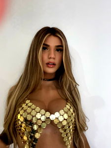 Chelsea is an adult model known for her unique styles. In this image, she's wearing a golden metallic bra adorned with coins. The backdrop is minimalist to keep the focus on Chelsea.