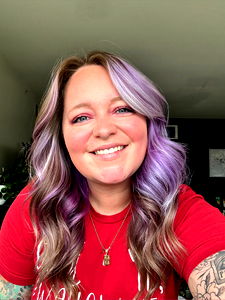 A vibrant Alabama-based OnlyFans model with long purple hair, sporting a festive red and white shirt and adorned with tattoos. The image showcases her cheerful demeanor amidst holiday decor.