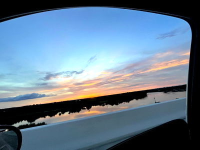 This captivating image showcases a serene sunset, where the sky is painted in hues of orange and pink. The bridge stretches across the calm river below. The tranquility of the scene evokes a sense of peace and reflection. This could be an ideal photo to share on social media or for use in travel-related content. It's a great representation of nature's beauty.