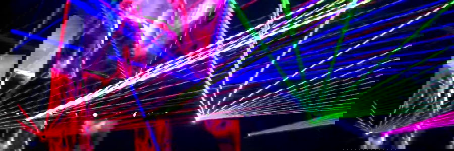 Ashley Stone is seen in the foreground, surrounded by a vibrant display of laser lights, indicating her participation in a lively event. The image captures the excitement and energy of the concert setting, with Ashley Stone seemingly enjoying the performance.