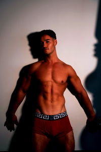 A muscular fitness model poses confidently for the camera in a minimalist setting, showcasing his toned physique and athletic wear.