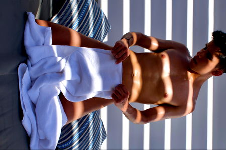 23-year-old male model Ashton Grey from Colombia showcases his physique in a beachfront setting. He is captured in a relaxed pose, sitting on a lounge chair with a serene backdrop of palm trees and clear skies. The model is dressed casually in swim shorts and has a gold necklace that adds a touch of elegance to his look.