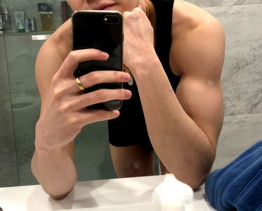 A muscular man showcasing his physique, taking a mirror selfie in his bathroom with a smartphone. He is wearing casual athletic attire and has a distinctive tattoo on his arm.