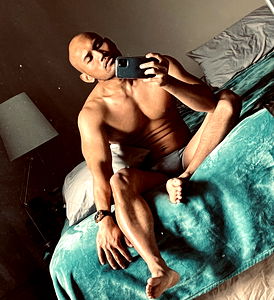 A young, muscular Asian man flexing his bicep in a home gym. He is shirtless and showcasing his fitness journey. OnlyFans link in bio.