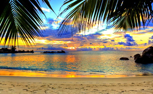 Embrace the tranquility of a tropical sunset over a deserted beach, with the gentle lapping of waves and the soft glow of the setting sun. A perfect getaway awaits!
