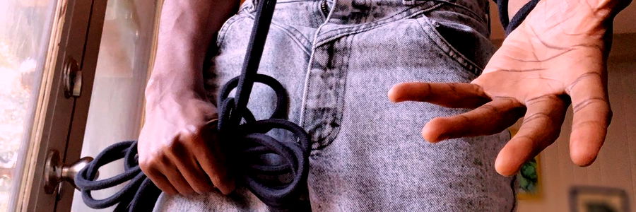 Isaac, a popular model on OnlyFans, is seen here wearing a tie-dye t-shirt and holding a large rope. He is striking a pose with the rope tied around his neck. The background suggests an indoor setting with a beige wall and a window on the right. Isaac appears to be a young adult male.