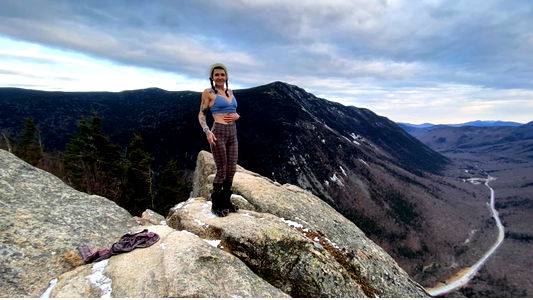 Aspen, a female model posing in a natural environment, showcasing an athletic build and fitness attire. She stands confidently with one hand on her hip and the other pointing downwards, exuding a sense of strength and self-assurance.