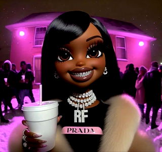 The image features a young adult woman with long, styled hair. She is holding a cup and is wearing a dark-colored top with the word 'RF' visible on it. Her attire suggests a hipster or urban style influence. The background shows a night scene with people gathered outdoors. There is no text present in the image to provide additional context.