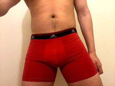 A powerful and confident pose, showcasing a full-body view of the model in red underwear.