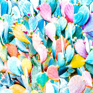 Vibrant array of cacti in pots, showcasing a variety of hues and pot designs.