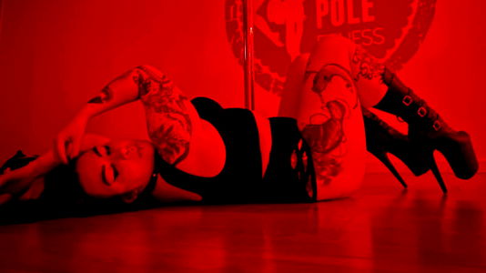 This image captures Astral, a UK OnlyFans model, in an unconventional pose. The model is wearing black boots and a leather strap. They are seated on a metal chair, facing the camera, and have their hair styled in a way that adds to the uniqueness of the image. The background features a warehouse-like setting with corrugated walls and a high shelf, suggesting an industrial environment. This photo is a blend of fashion photography elements and a creative twist.