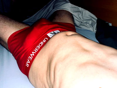 The young man, Ashen One, showcases his defined muscles. His shirtless torso is the focal point against a dark background. From Brescia, Lombardia.