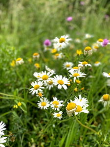 The image showcases a vibrant display of daisies against the backdrop of lush green grass, with small purple flowers adding a touch of contrast. The focus is on the center of the frame where the majority of the daisies are located, demonstrating their full bloom condition.