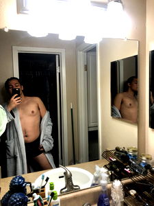 In this image, we see the renowned OnlyFans content creator, Astro, striking a pose. He is positioned against a bathroom mirror, holding up his phone as if capturing this candid moment. His attire consists of a casual ensemble, complete with a unique tie that adds a touch of style to his outfit. The backdrop features a simple white tiled wall, providing a clean and minimalist aesthetic for the photo.