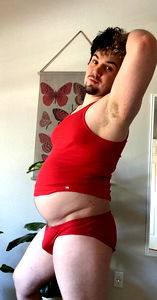 Astrodough, a prominent OnlyFans model, is embracing body positivity with confidence. In this image, he is showcasing the latest addition to his athletic wardrobe โ a red tankini top and matching bottoms. Astrodough's choice of attire reflects his dedication to promoting self-love and acceptance of different body types in fitness culture. The model stands confidently in front of the mirror, flexing muscles, demonstrating that fitness and body positivity are not mutually exclusive.