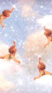 Artwork depicts a collection of angels floating amidst a starry night. The illustration is characterized by its celestial background and the angelic figures, each with a unique expression of joy or peace. This piece conveys hope and positivity. OnlyFans model name is Athena โจ, from: California, USA