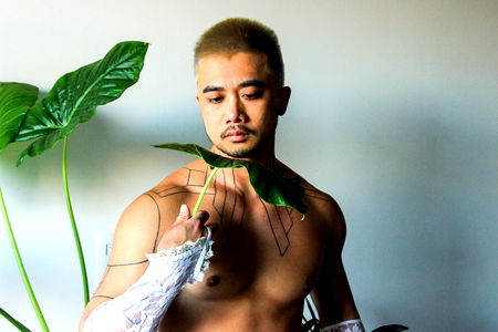Model Jong Master from Buenos Aires. Tattooed, muscular physique. Posing in front of a green plant with a neutral expression.