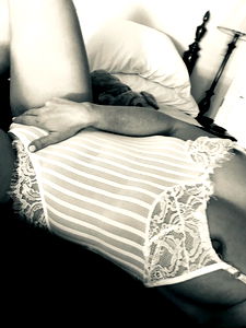 The image features an attractive woman who appears confident and comfortable. She is captured from behind, showcasing her lingerie. Her pose suggests she may be a model or someone with a strong sense of self-assurance. The background indicates that this might be a professional shoot.