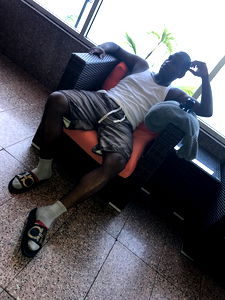 The image captures a candid moment of Atlantaboyt, a popular model from Atlanta, in an unconventional pose. Wrapped in a vibrant blue blanket, he is seen holding onto his jacket, perhaps signaling the end of the day or the need for warmth.