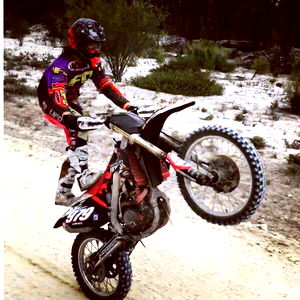 A daring stunt rider executing a wheelie on a dirt bike, showcasing skill and control. This image could be associated with extreme sports or motorcycle events. The model appears to be a young male with an interest in off-road biking.