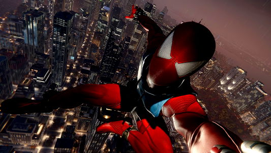 In a futuristic city, a red and blue superhero in a dynamic pose is captured in mid-air action. The hero seems to be in pursuit or perhaps preparing for battle.