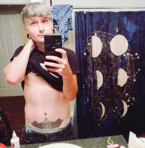In the image, there is a person taking a selfie in front of a mirror. The individual appears to be shirtless and has a visible tattoo on their chest. They have short hair, and it seems like they are in a personal space, possibly a bathroom. The background shows a wall with a clock and a patterned curtain. The young man is holding up a phone to take the photo. There is also a window that allows natural light into the room.