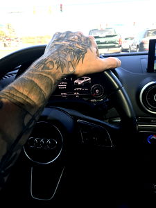 A tattooed driver steering a car on a road. The photo captures the essence of a road trip, with the driver in focus against a blurred background. Onlyfans model name is Byron.